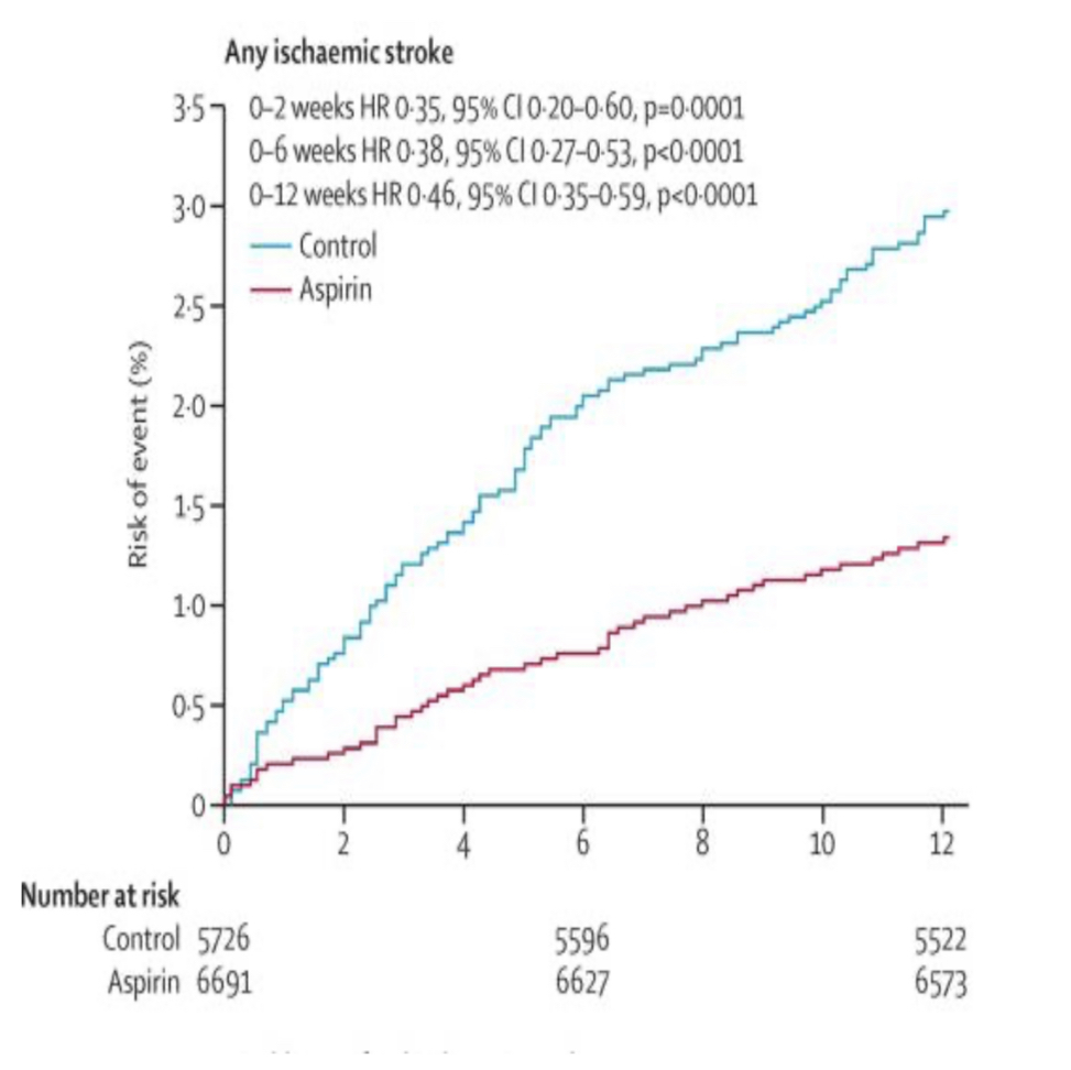 • The benefit of taking aspirin is visible within the first few weeks following the initial stroke
