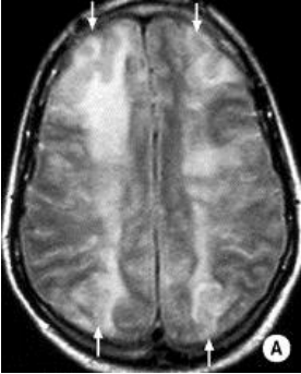 What is the general pathogenesis behind her symptoms and the MRI findings?