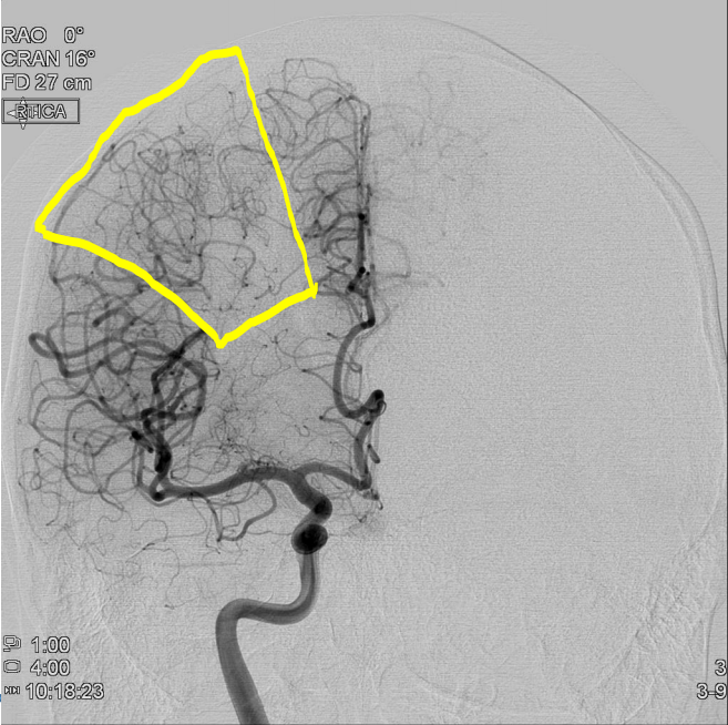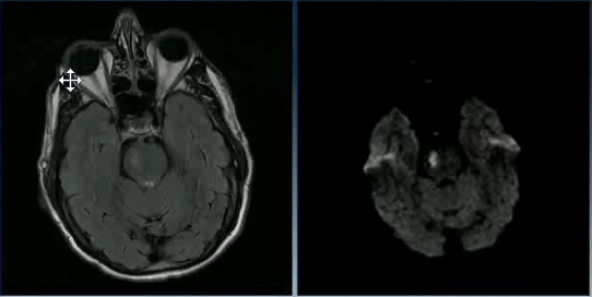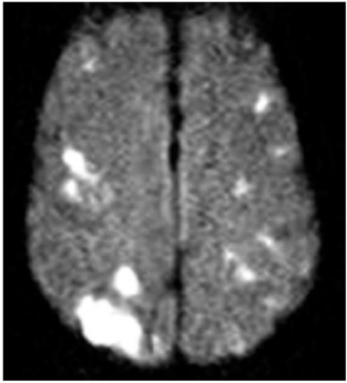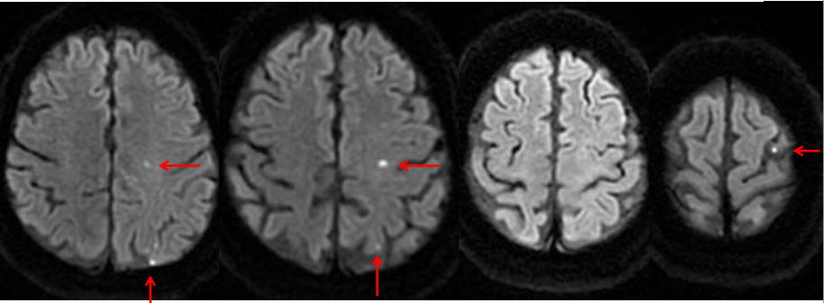 The MRI shows very tiny, punctate infarcts throughout several axial layers of the cortex that all appear to be in the same location sagitally/coronally, aka all in the territory of one small vessel! This supports a small embolus that occluded only the area of one small brain vessel.