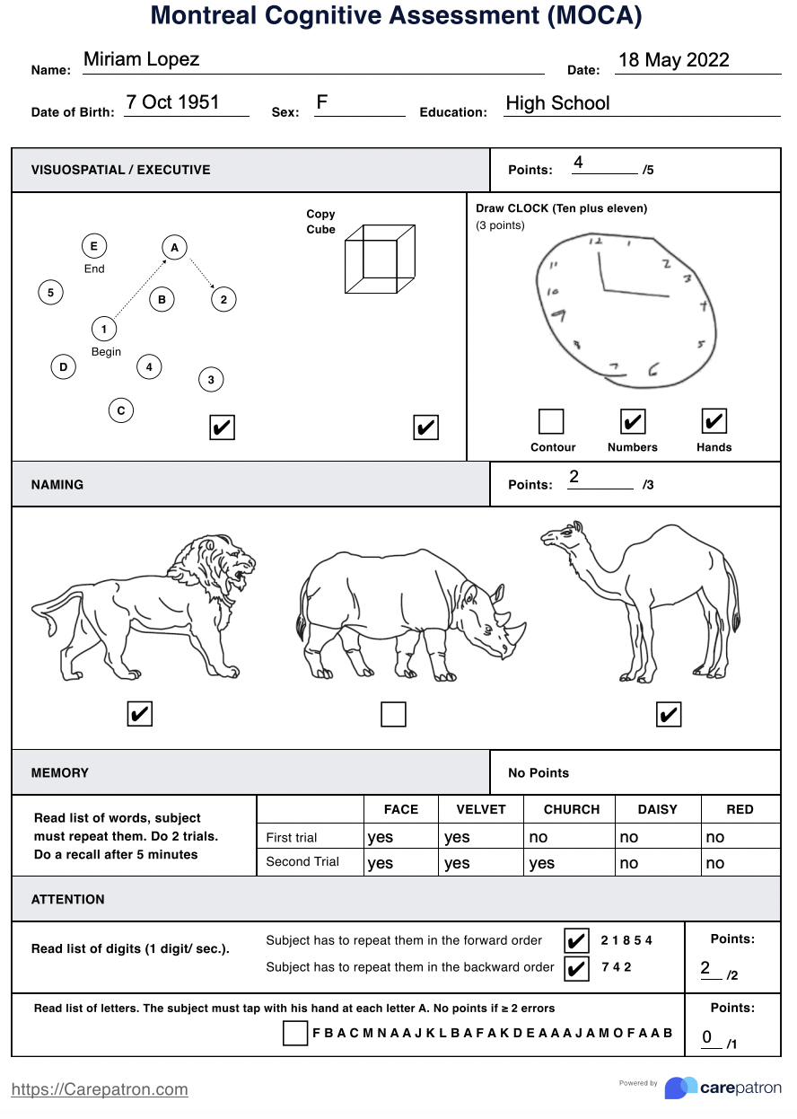 Screening tool to assess cognitive function; memory, attention, visuospatial abilities, language, and executive functions.