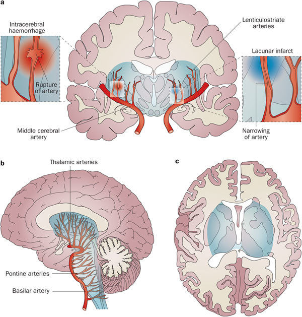 Common sites for lacunes and hemorrhages