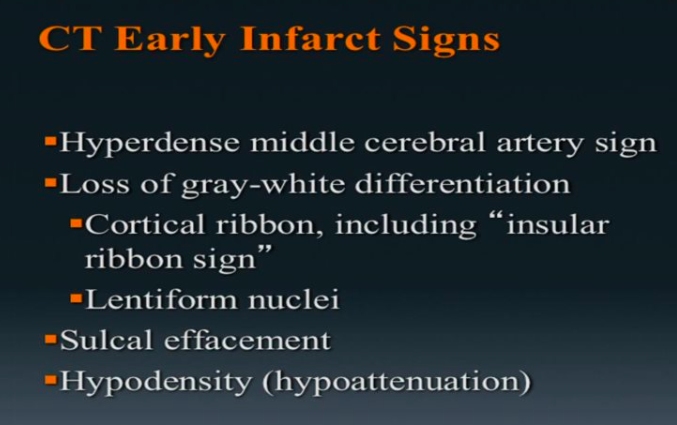 Signs of stroke: facial drooping, weakness one side of body, time sensitive to tx