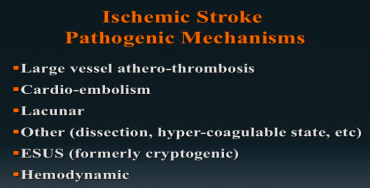 Cryptogenic/Esus (embolic stroke of uncertain source)= when the cause of stroke is not seen (the longer you wait from onset the less likely you are to find a cause)