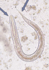 1) Cuando se presentan en el medio ambiente condiciones desfavorables, falta de alimento, plétora de individuos, temperaturas muy altas, las larvas L1 pueden evolucionar a L3 filariformes, más largas y finas, con esófago cilíndrico, sin bulbo muscular. Su extremidad posterior es cónica y presenta una muesca terminal. De esta forma se origina el segundo tipo de ciclo vital de S. stercoralis (directo e indirecto).