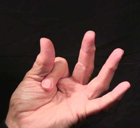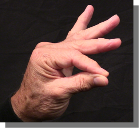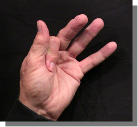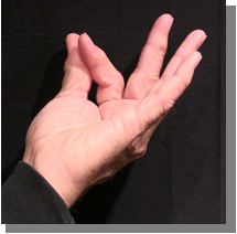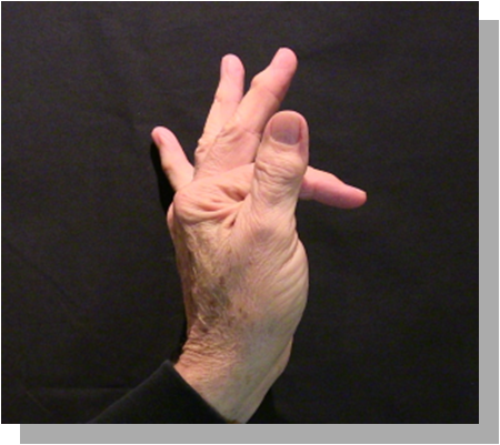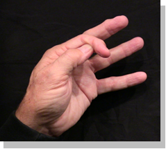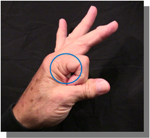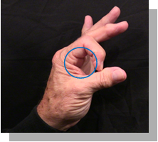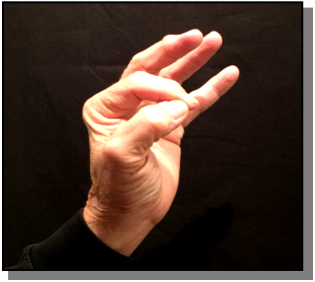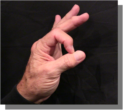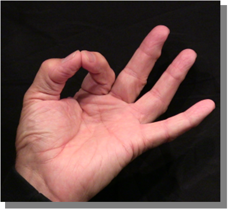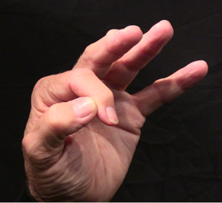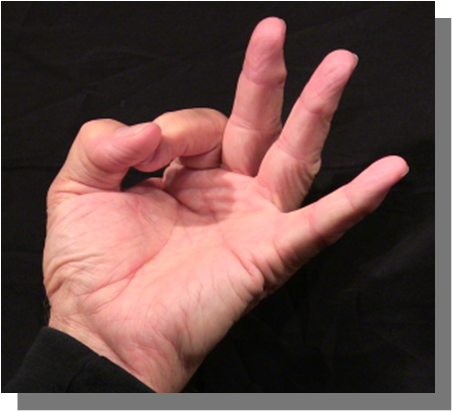Position: Fully flexed index finger closed is cradled into the ulna aspect of the thumb in line with the thumb.