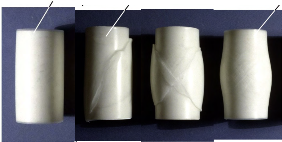 4) sample compressed under conditions of deep crust. it has deformed and bulged smoothly in a ductile way