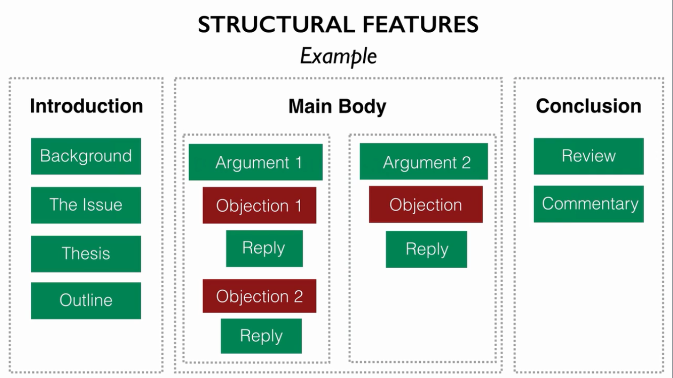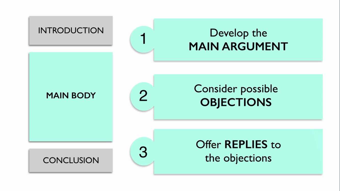 What should be included in the Main Body of a standard argumentative essay?