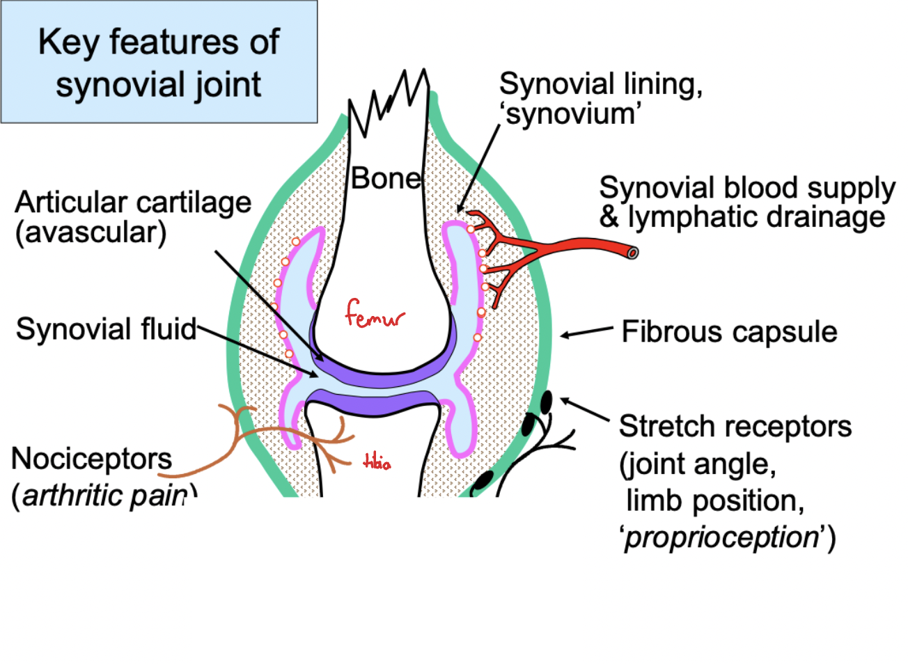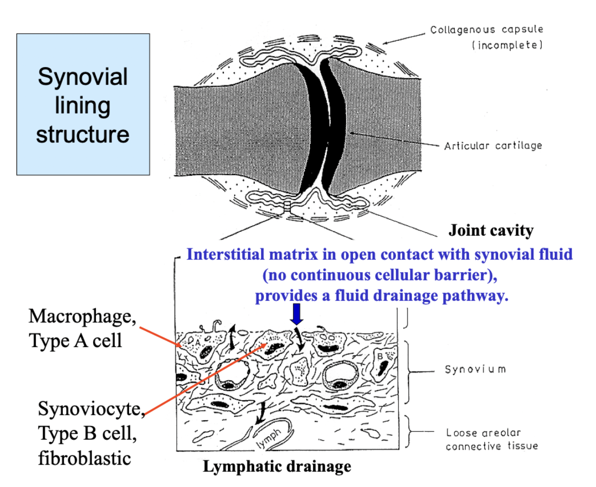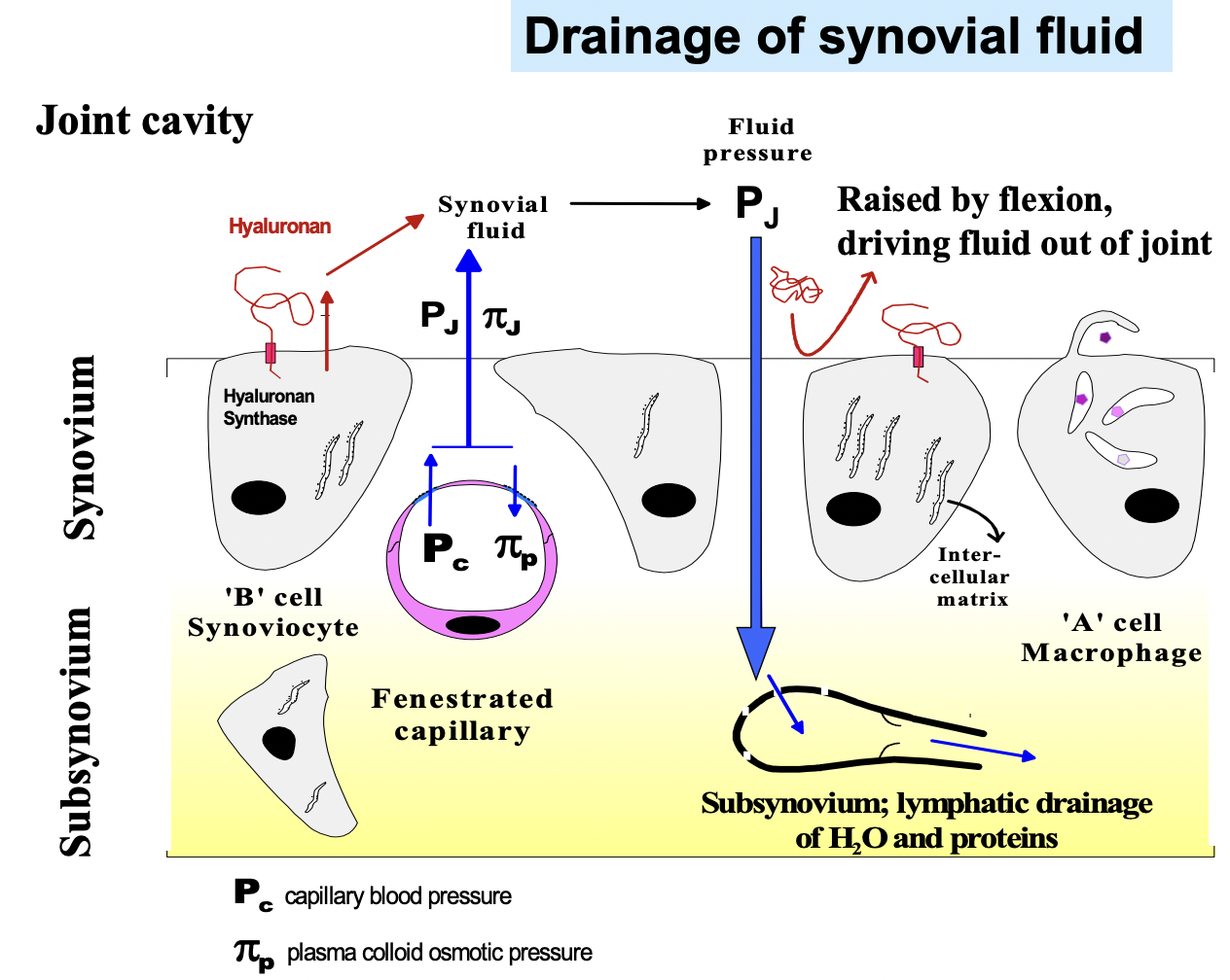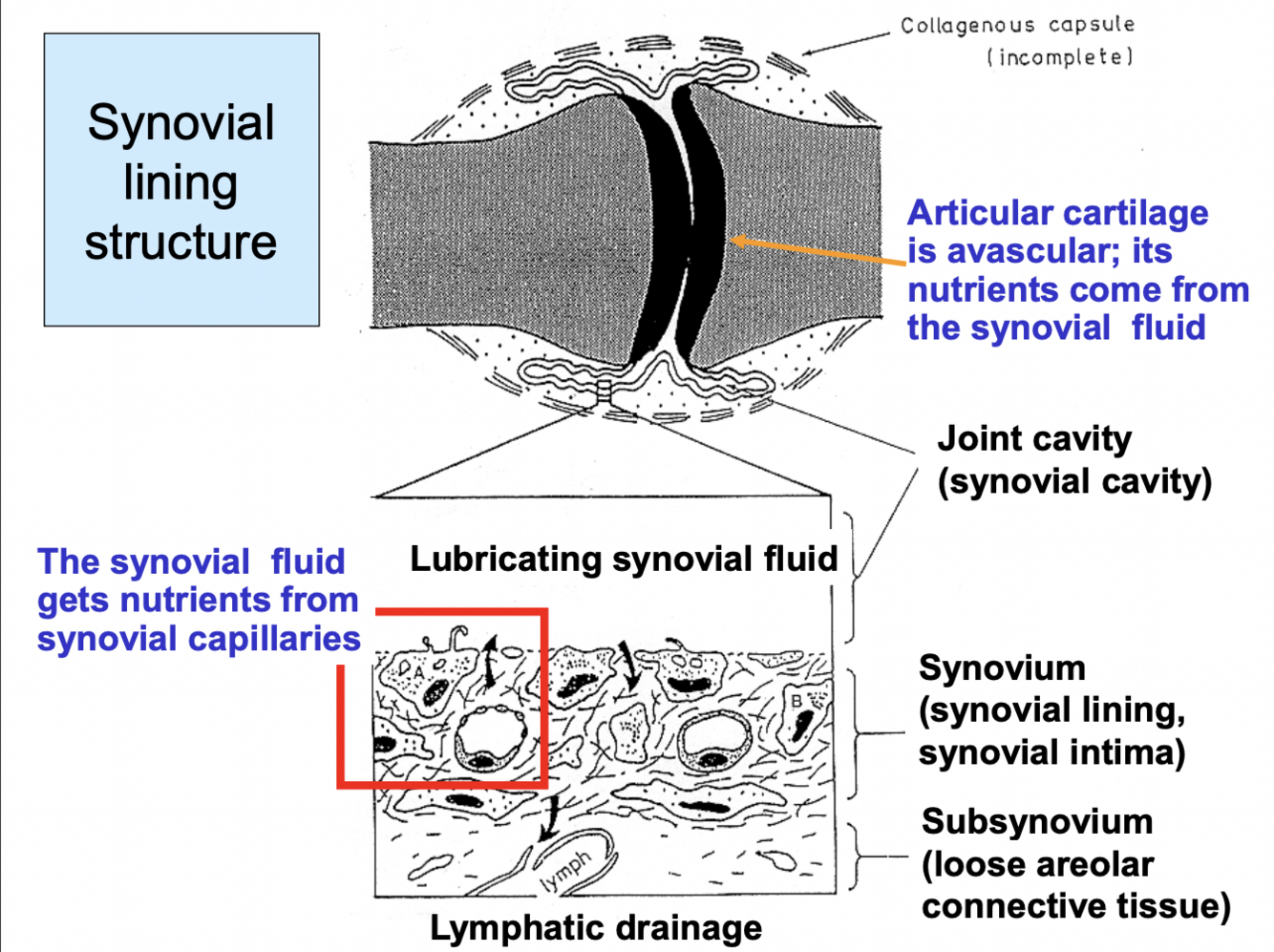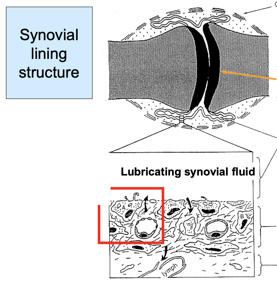 Synovial lining creates lubrication + lymphatic drainage out of a joint