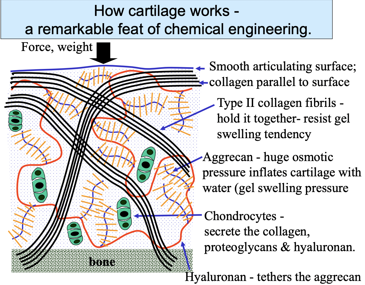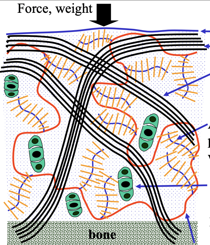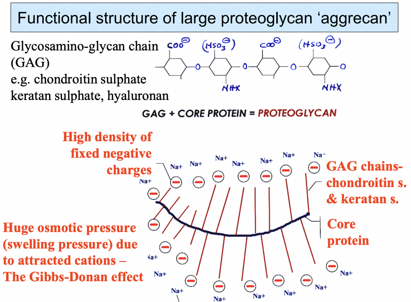 These chains form a large, negatively charged polymeric structure with a core protein - draws water inside it, maintaining tension & good compressibility