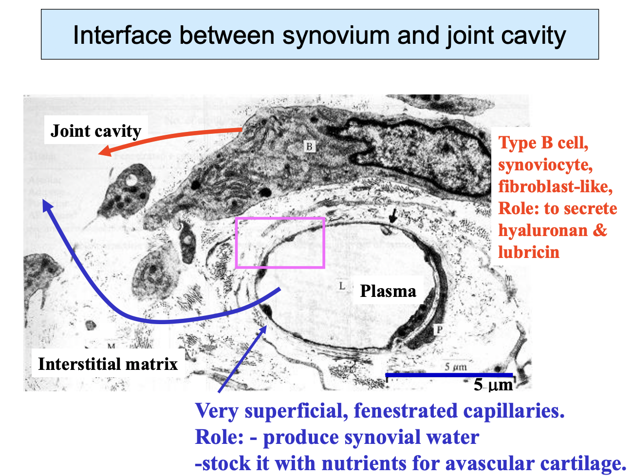 Synovial fluid = an ultrafiltrate of plasma generated by fenestrated capillaries just below synovial surface.