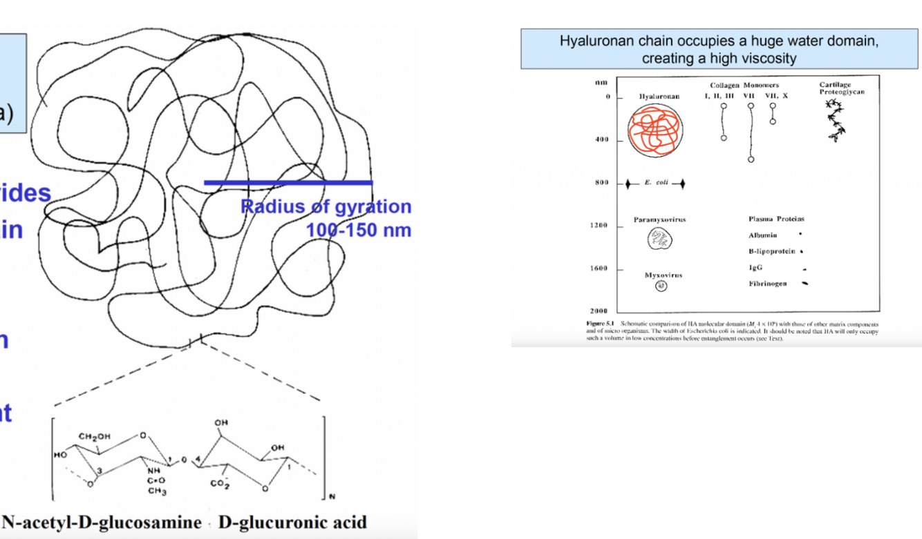 Hyaluronan=giant nonsulphated GAG, Mw 6 million, hydrated radius 100-200 nm. This makes synovial fluid v viscous, enabling hydrodynamic lubrication - low load & high velocity - like oil in a car engine.