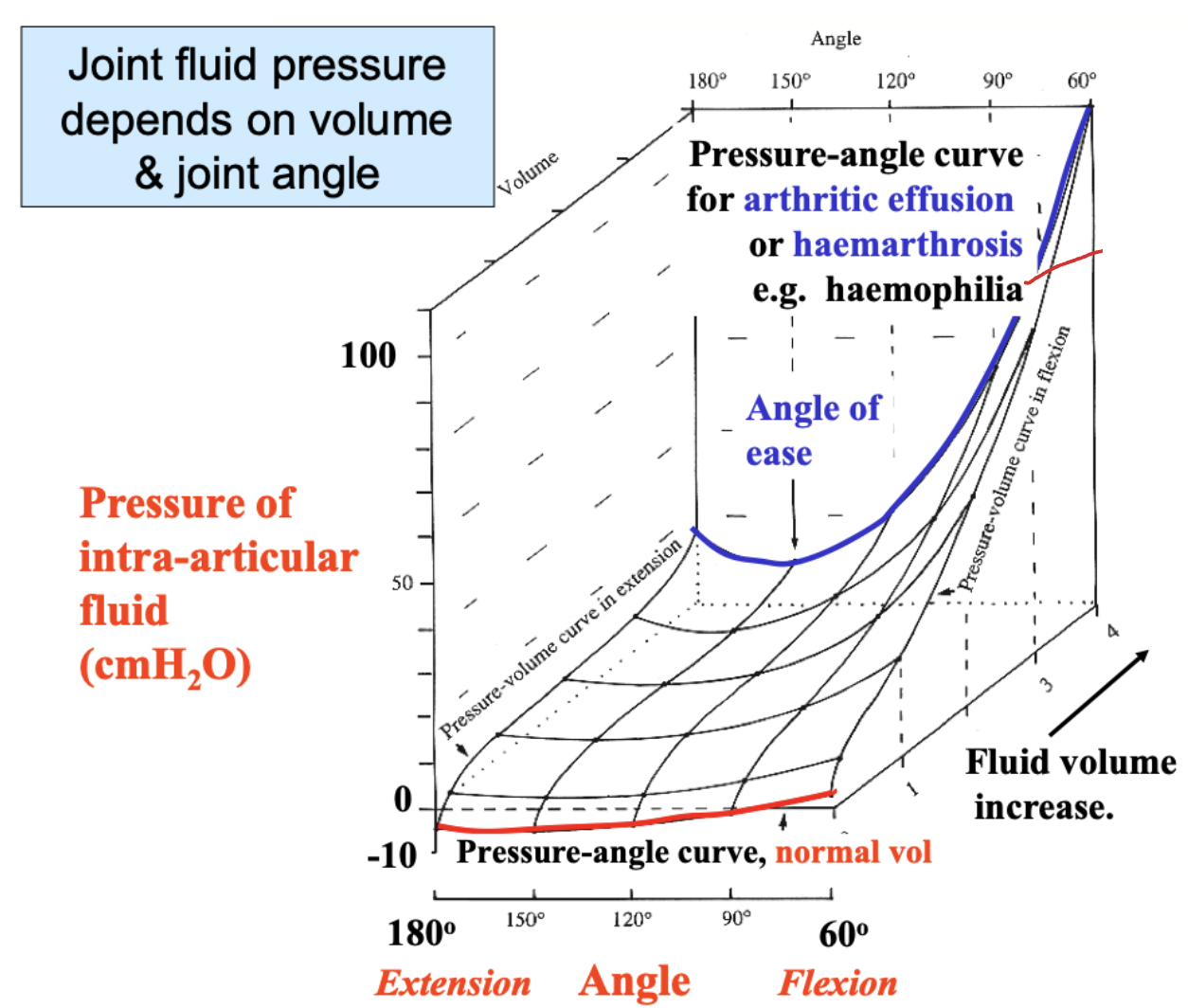 But if the fluid keeps building, then the angle of ease increases and this pressure angle curve is altered in an arthritic effusion or haemarthrosis (e.g. in haemophilia-blood stained fluid in knee creating a haemarthrosis)