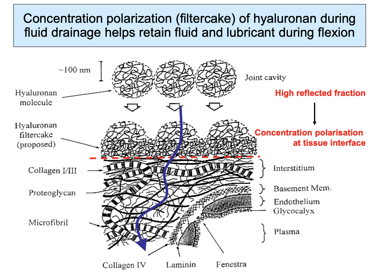 The concentration polarisation (filtercake) of hyaluronan is a v large polymeric structure. This helps retain fluid & lubricant during fluid drainage