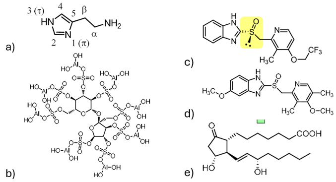 a) histamine, c) dexlansprazole, d) oméprazole, e) PGE1