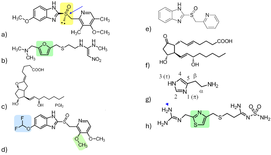 a) esoméprazole, b) ranitidine, c) PGI2, d) pantoprazole, e) timoprazole, f) PGE2, g) histamine