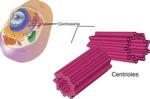Centrioles: a pair of tubular structures taht move to opposite ends of a cell during cell division.