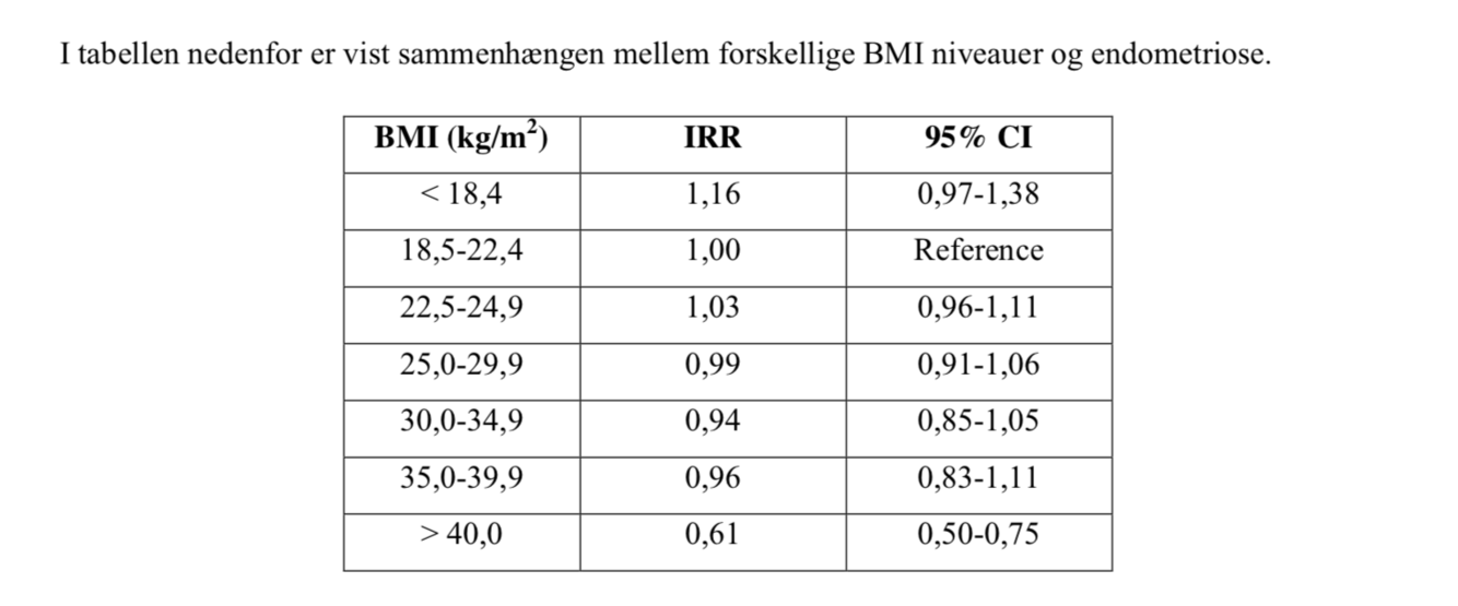Det ses af tabellen at risikoen for at få sygdommen falder når ens BMI bliver større. Der er størst risiko for at udvikle sygdommen når man har et BMI under 18,4.