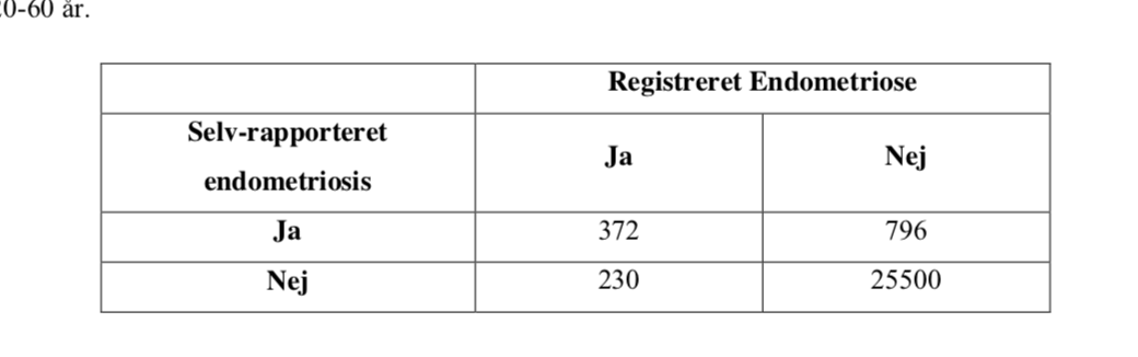 Beregn sensitivitet og specificitet for selv-rapporteret endometriose, hvis vi antager, at registerdata er de korrekt diagnosticerede patienter.
