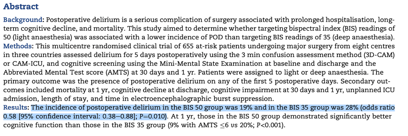 Significant difference in post op delirium. No significant difference in one-year mortality in high risk elderly patients between the deep (BIS 35) versus light group (BIS 50), or any of the secondary outcomes, and there was only one case of awareness in the light group, providing reassurance that deeper anaesthesia is safe.