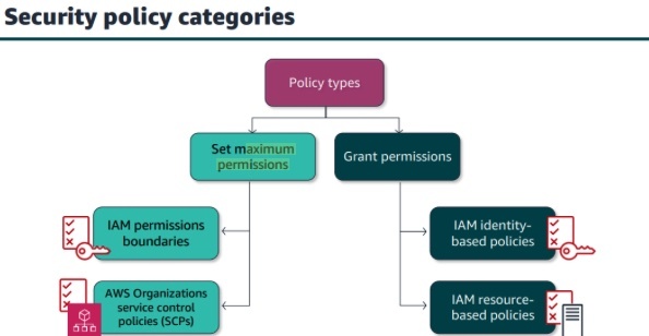 Exam - know the difference … resources refers to AWS service policies; permissions boundaries are guardrails; don’t have permissions to SCPs; to give access you Grant permissions (IAM identity-based policy & IAM resource-based policy); you set maximum permissions through IAM permission boundaries and AWS org service control policies (SCPs)
