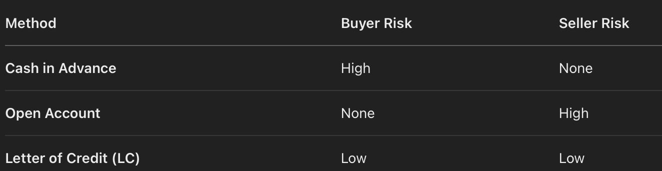 Define the different types of payment methods that can occur in international trade.