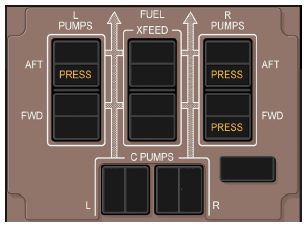 EICAS advisory messages CTR L FUEL PUMP and CTR R FUEL PUMP