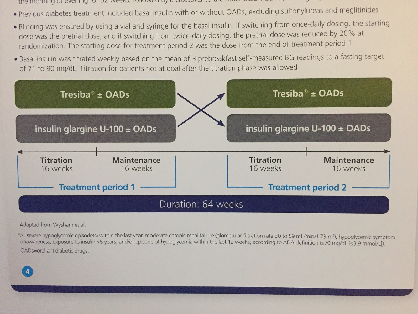 Patients were randomized 1:1 to either Tresiba or glargine for a 16-week titration period followed by a 16-week maintenance period. Patients then crossed over to the other basal insulin and did a 16-week titration period followed by a 16-week maintenance period.