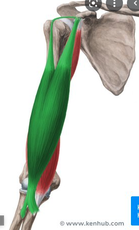 (Bicep brachii) Flexes forearm, powerful supinator of forearm. Long head flexes arm.