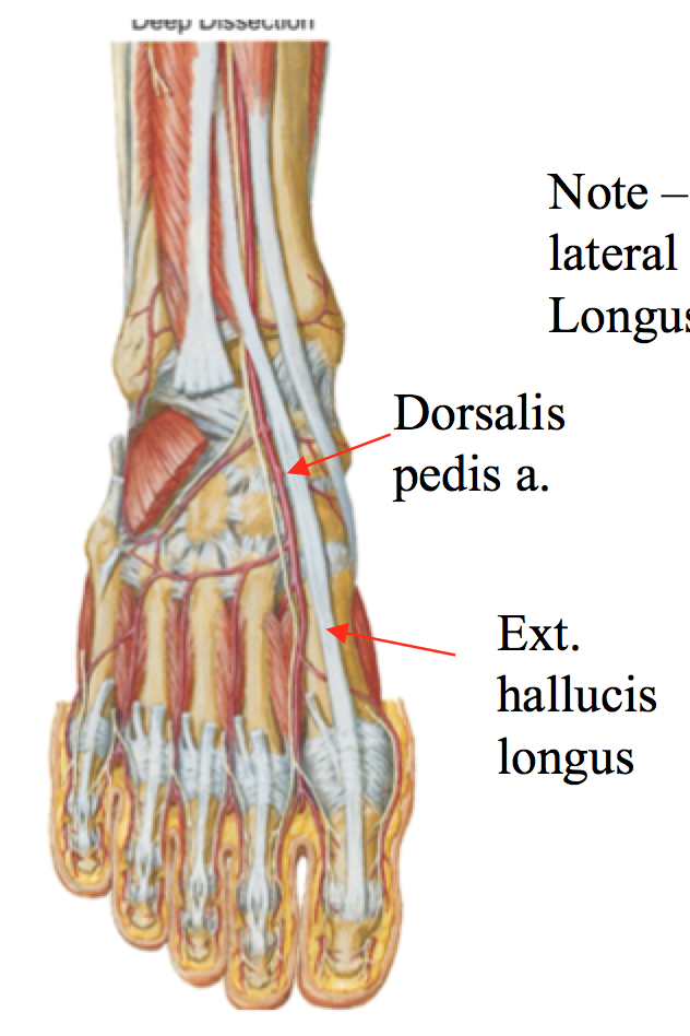 The dorsalis pedis artery is LATERAL to the extensor hallucis longus.