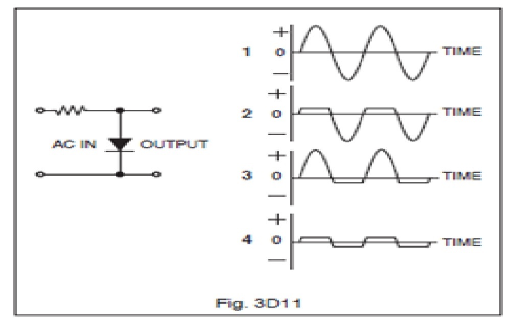 With a pure AC signal input to the circuit shown in Figure 3D11, what output wave form would you expect to see on an oscilloscope display?
