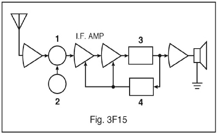 In Figure 3F15, which block diagram symbol (labeled 1 through 4) is used to represent a local oscillator?