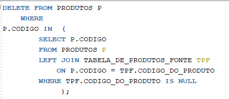 O que a subquery SELECT P.CODIGO FROM PRODUTOS P LEFT JOIN TABELA_DE_PRODUTOS_FONTE TPF ON P.CODIGO = TPF.CODIGO_DO_PRODUTO WHERE TPF.CODIGO_DO_PRODUTO IS NULL retorna?