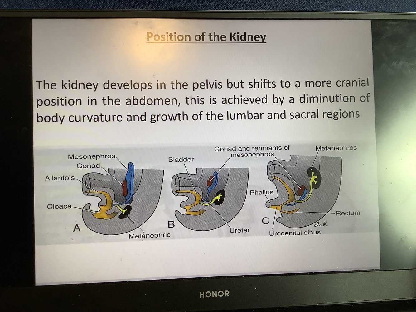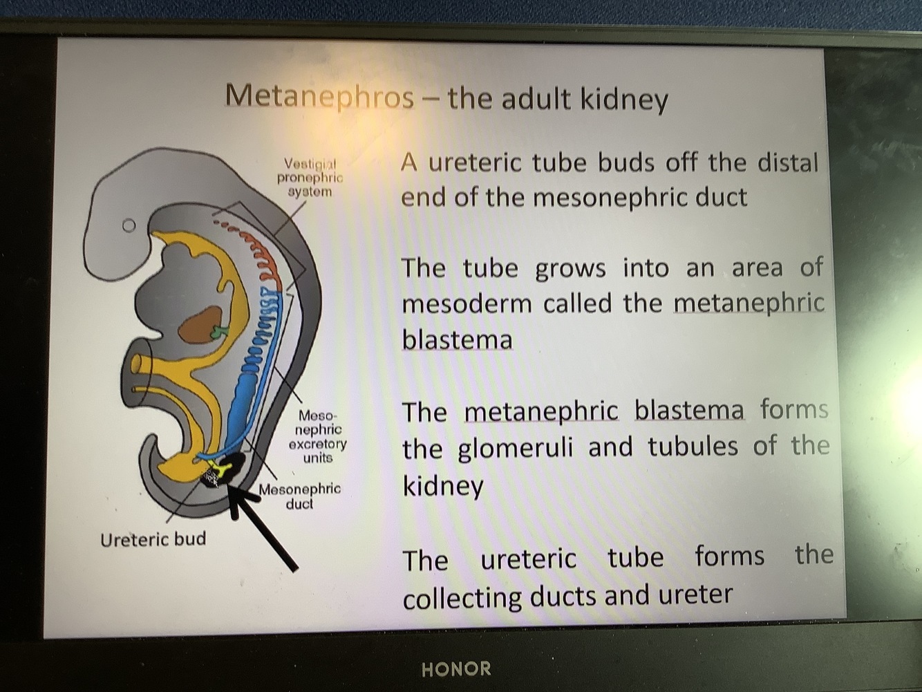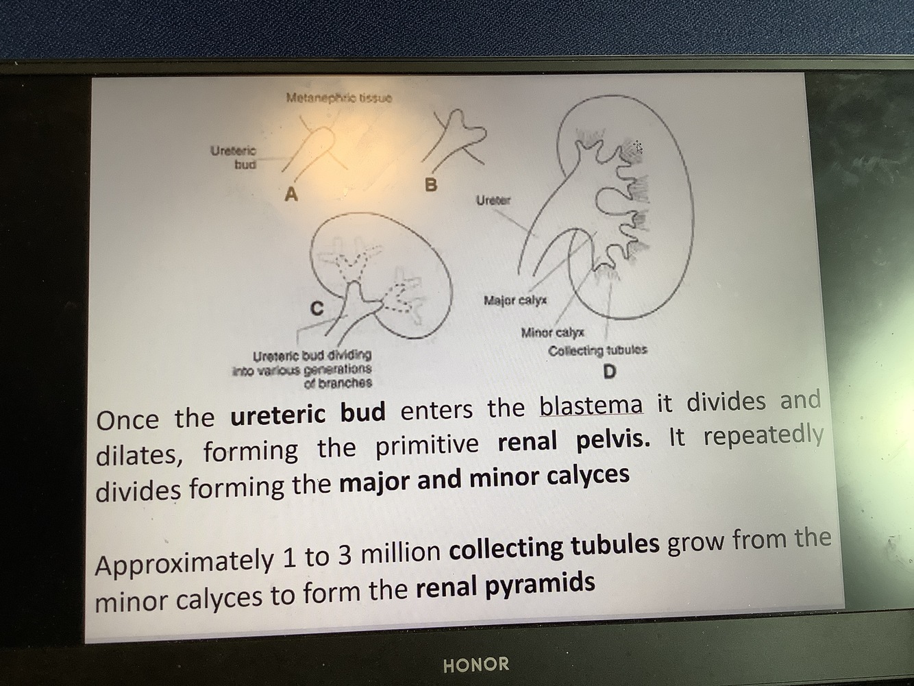 It divides and dilates, forming the primitive renal pelvis. It repeatedly divides to form the minor and major calyces