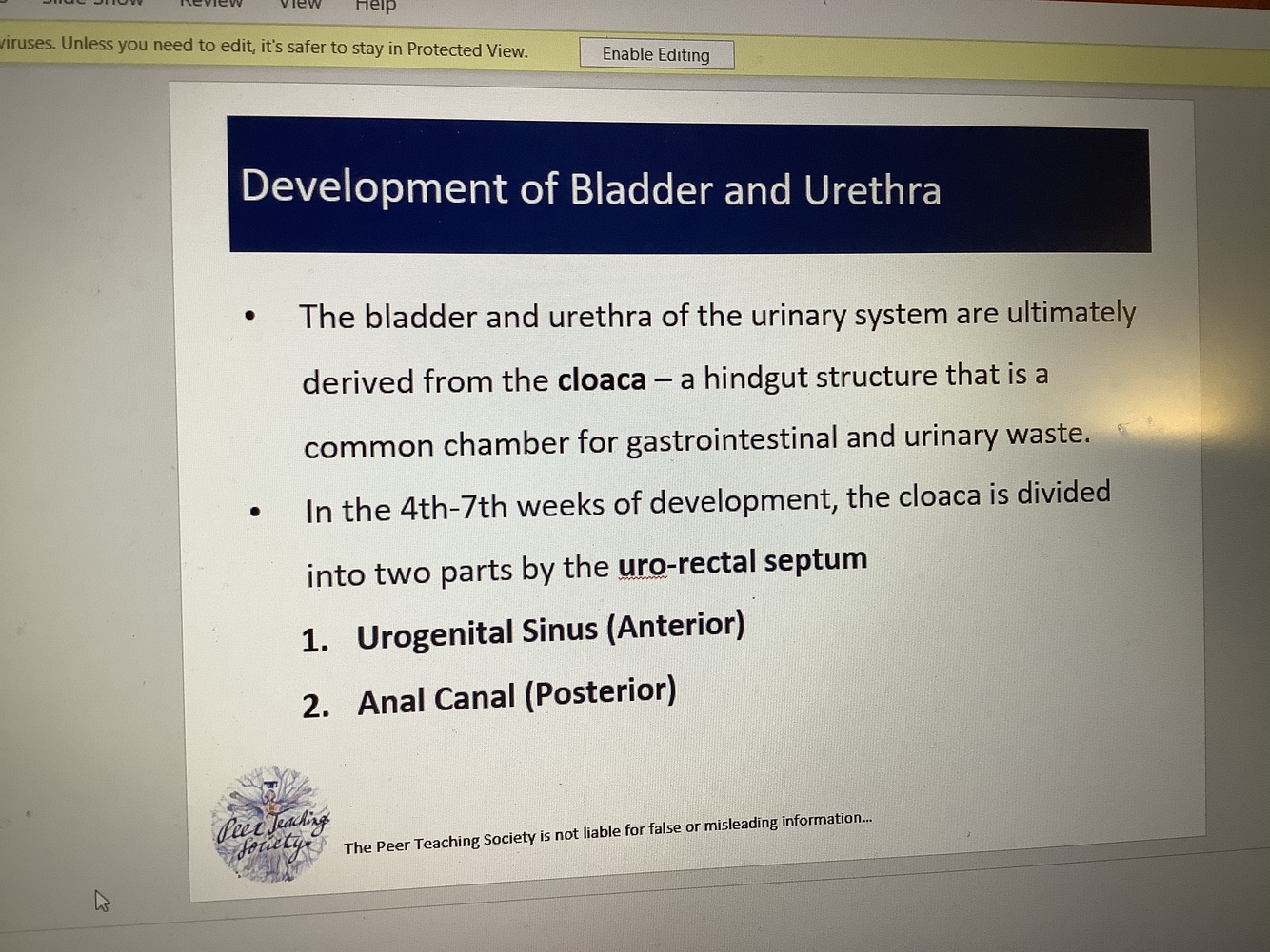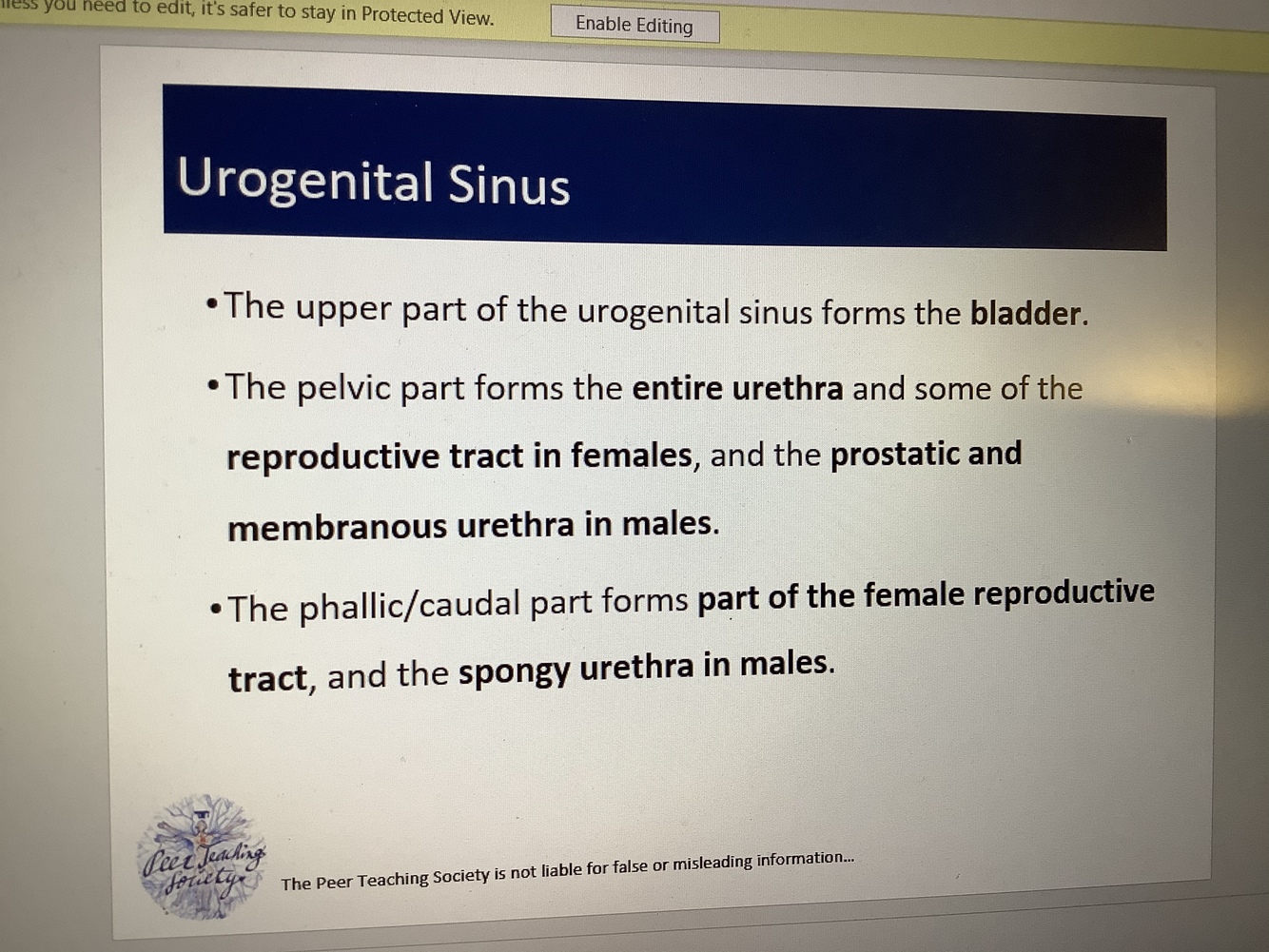 Where are the bladder and urethra ultimately derived from? What is this structure divided into?