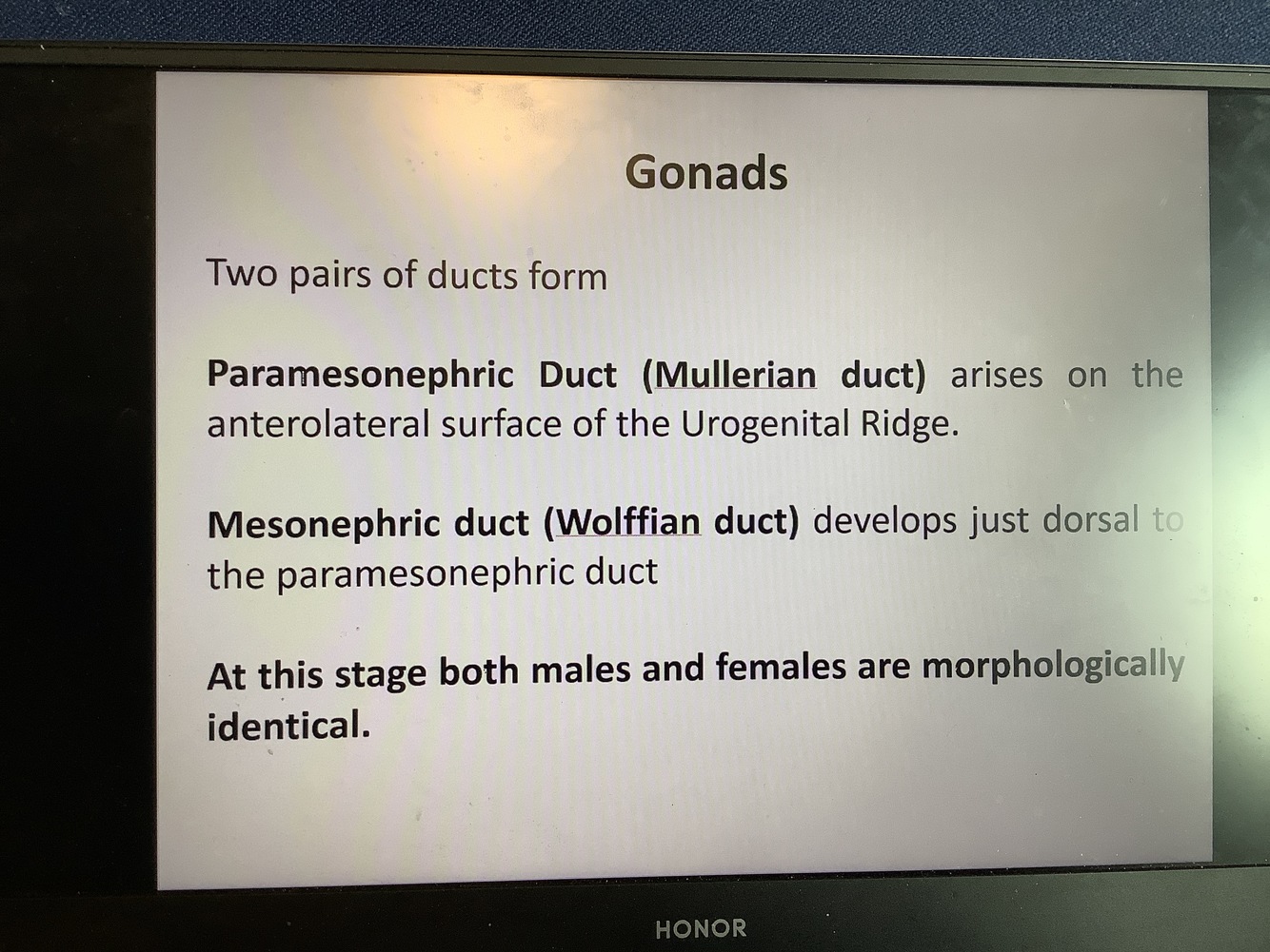 Where do both the male and female gonads derive from embryologically? Are the primordial gonads differentiated at 6 weeks?