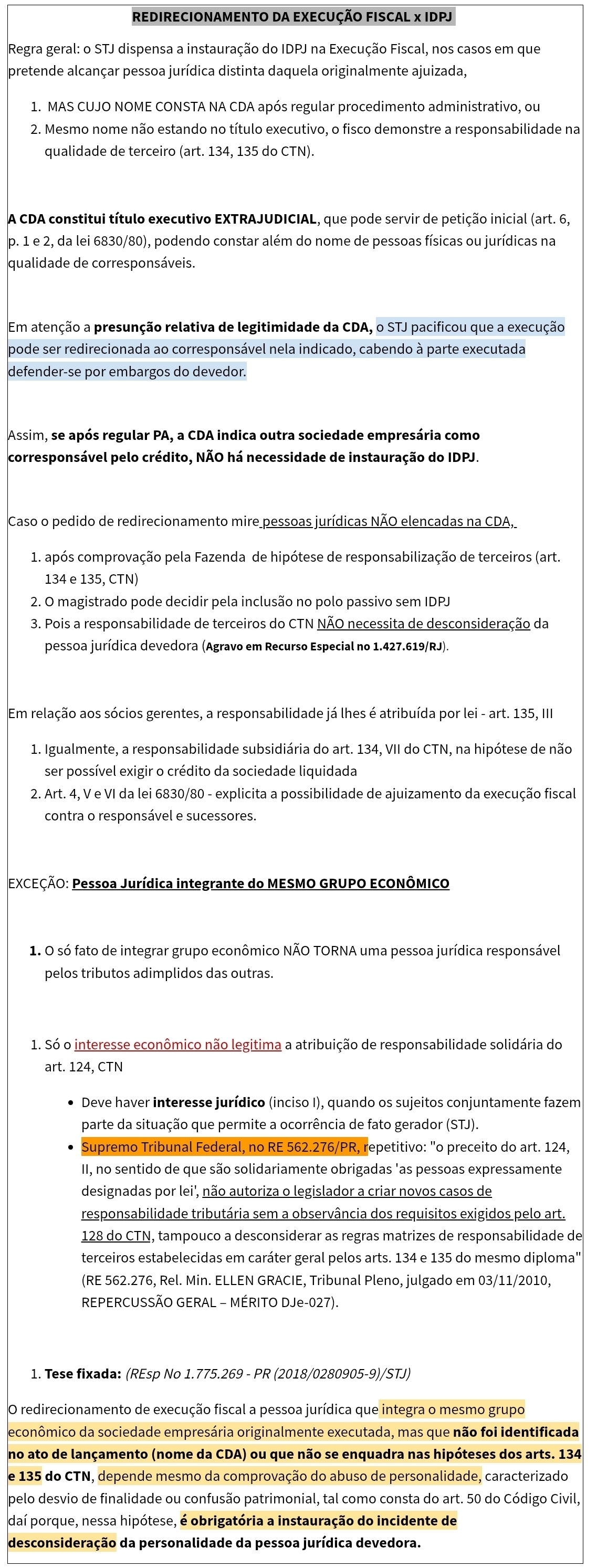 O redirecionamento de execução fiscal para a pessoa jurídica que integra o mesmo grupo econômico da sociedade empresária originalmente executada, mas que não foi identificada no ato de lançamento (nome na CDA) ou que não se enquadra nas hipóteses dos arts. 134 e 135 do CTN, DEPENDE da comprovação do abuso de personalidade, caracterizado pelo desvio de finalidade ou confusão patrimonial, tal como consta do art. 50 do Código Civil, de modo que, nesse caso, é necessária a instauração do Incidente de Desconsideração da Personalidade da Pessoa Jurídica devedora.