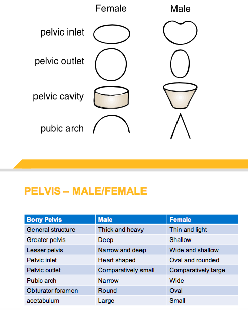 State the differences between the female and male bony pelvis