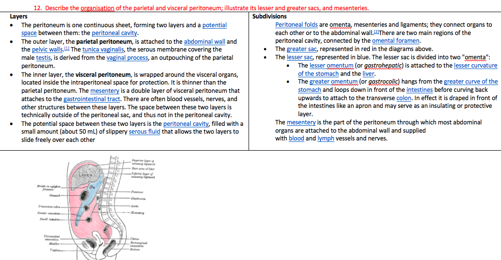 Describe the organisation of the parietal and visceral peritoneum; illustrate its lesser and greater sacs, and mesenteries.