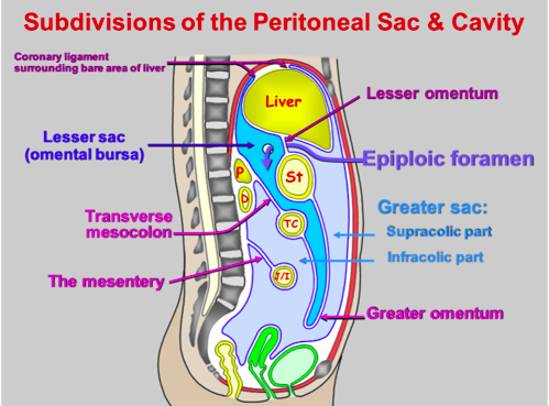Assess the possible uses/advantages of knowing the extent of the omentum boundaries and the peritoneal sacs.
