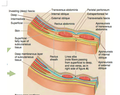 The ext. oblique, int. oblique, and transverse abdominis aponeuroses envelope the rectus abdominis muscle in a fascial sleeve known as the rectus sheath.