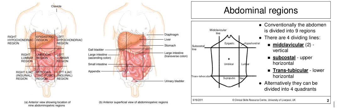 Analyse the reasons why there are 2 systems in dividing the abdominal area from a clinical point of view.