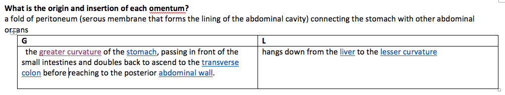 What is the origin and insertion of each omentum?