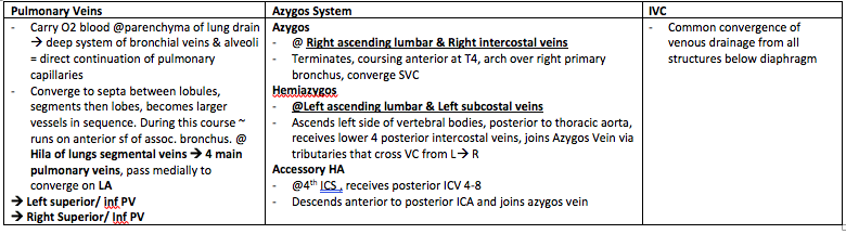 Sumamrise the patheway of the pulmonary veins, azygos system and the IVC