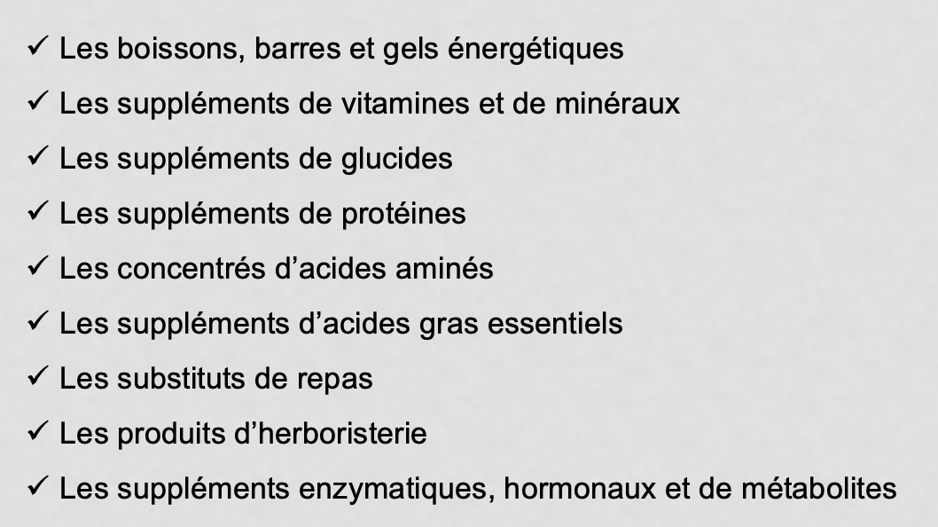 Boissons, barres et gels énergétiques, suppléments de protéines et de glucides, produits devant favoriser la perte ou le gain de poids, substituts de repas, etc.