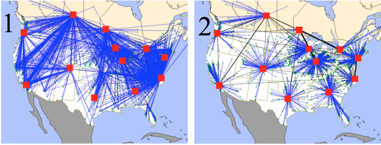 The answer is that it depends on the objective. In the map on the right the objective is service (reduce response time to the customers) while in the map on the left the objective is to minimize total cost