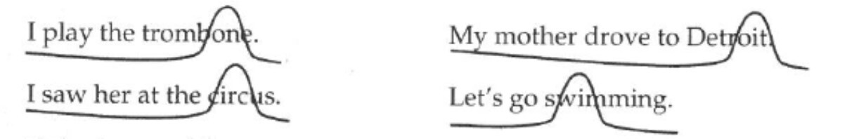 Here, we see a rise-fall pattern. Note that the rise-fall is over the vowel in the stressed syllable of the word.