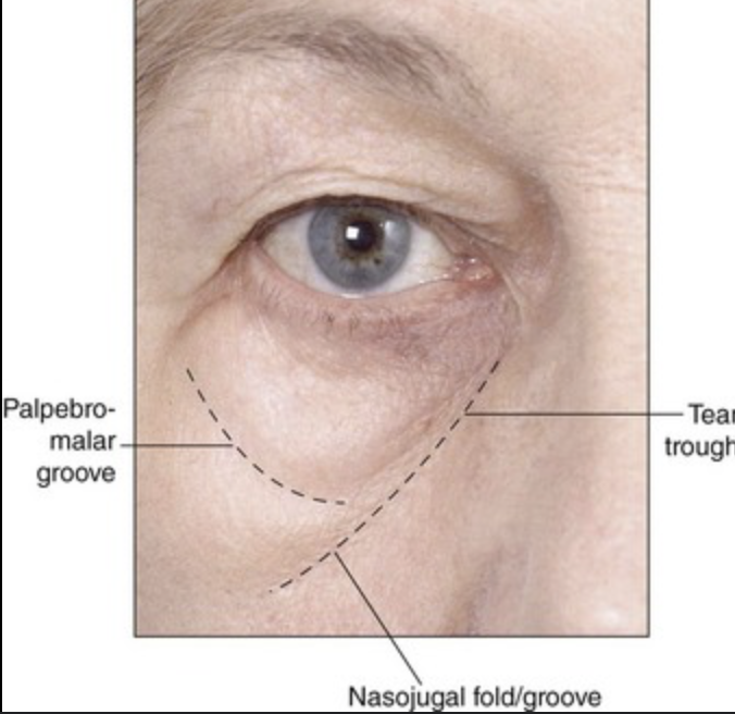 This fold, also known as the tear trough, is a groove that runs from the inner corner of the eye down the cheek towards the nose. It’s a natural anatomical structure and can become more prominent with age and volume loss.