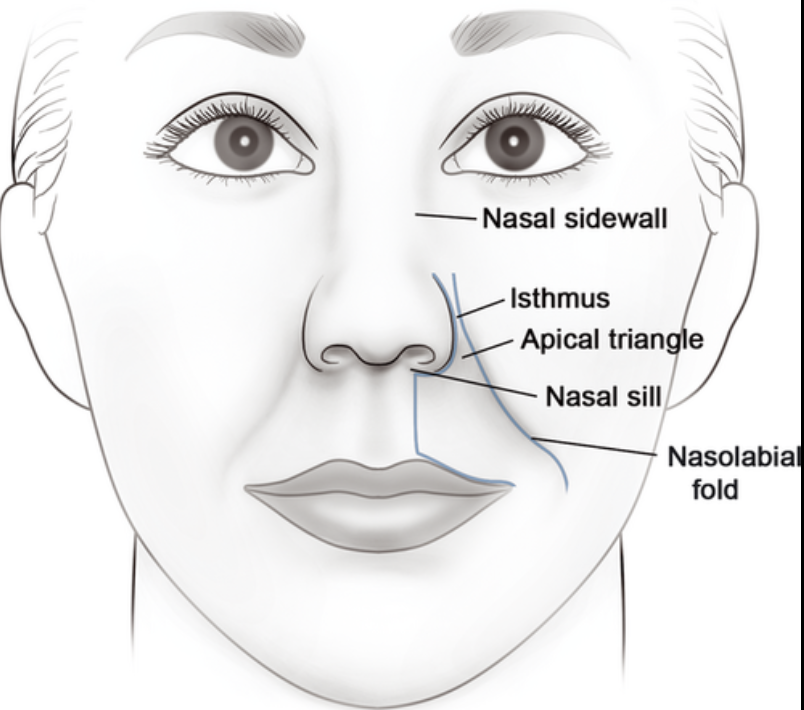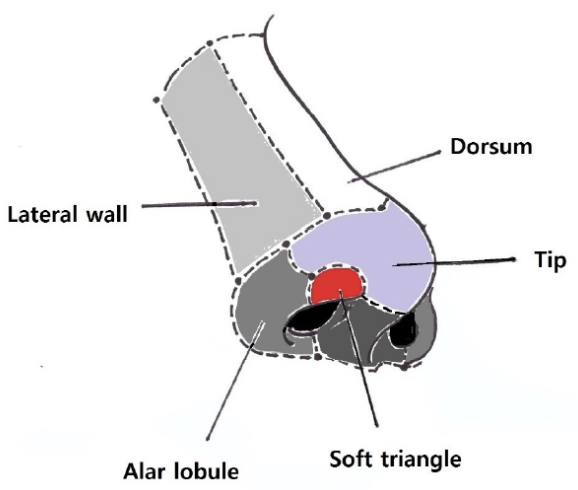 The soft triangle is situated at the tip of the nose, between the dome of the alar cartilage (the rounded part at the tip of the nose) and the nostril rim.