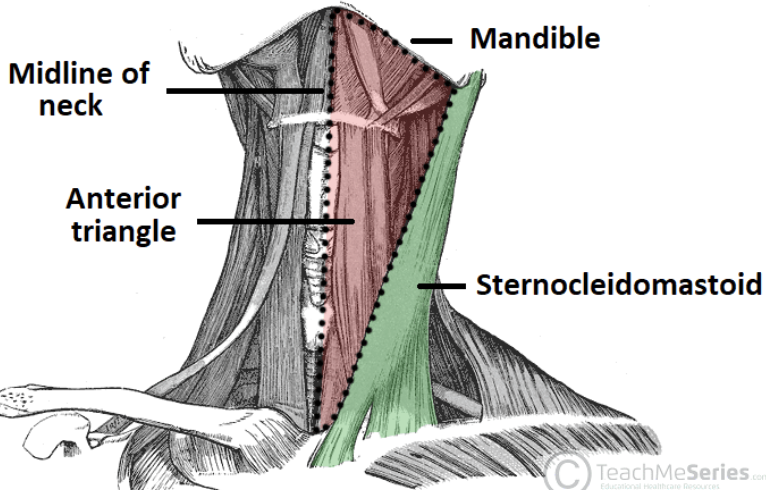 The anterior triangle is a region of the neck defined by the mandible (lower jaw), the sternocleidomastoid muscle, and the midline of the neck.