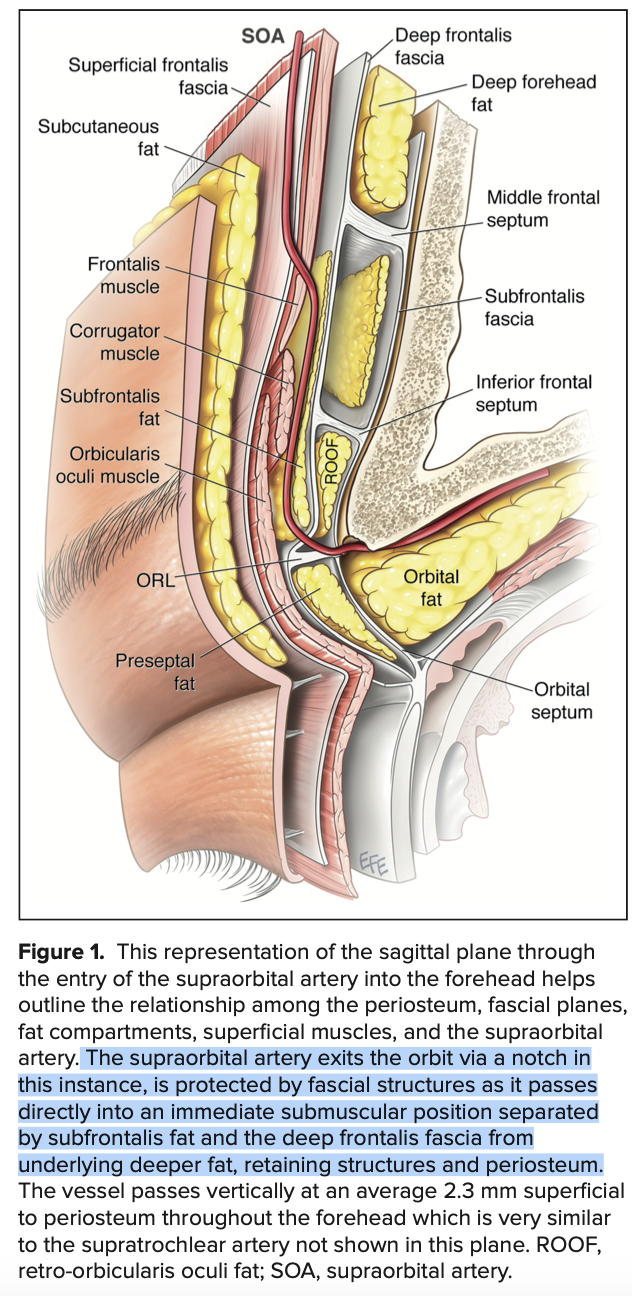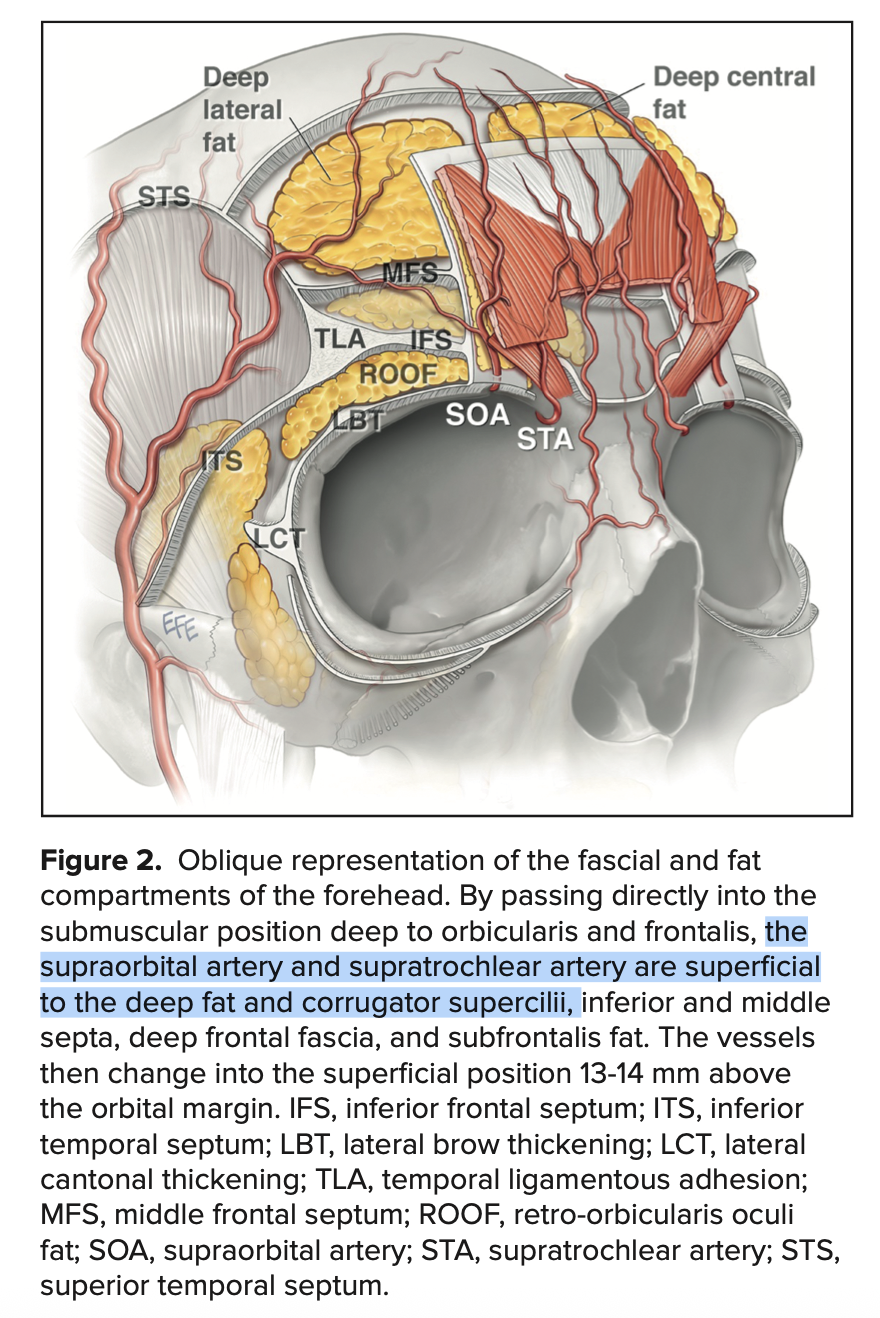 As it ascends, it transitions from deep to superficial to the frontalis muscle, eventually residing in the subcutaneous plane